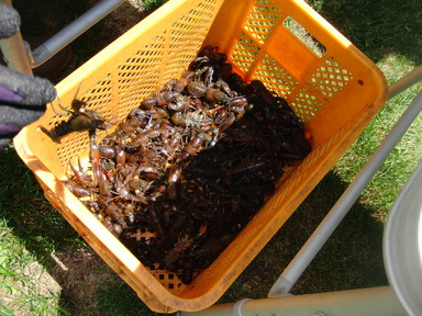翌日から捕獲したザリガニを回収し餌を追加して再投入。これを金曜日まで繰り返します。捕獲したザリガニは、体長を計測し、雌雄、抱卵、ハサミの欠損を観察して集計します。生態解明の資とします。
