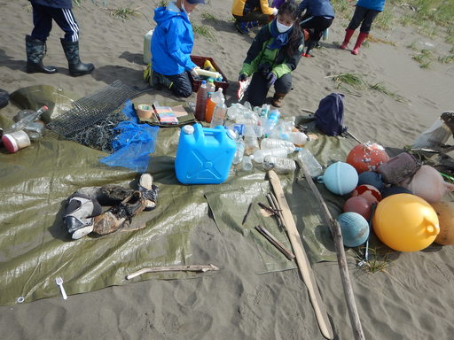 これらは、事前にみんなで考えて、砂浜に絶対あると思う8種類<ペットボトル、木(流木)、貝、網、浮き、瓶、空き缶、サンダル>を決めて集めたものです。