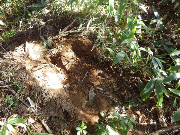 写真の左上を頭の方向にして前足の肘を折ってたたみ腹を地面に押しつけていたようです。両肘が深く地面に押し込まれています。その後方には立ち上がったときに付いた蹄の跡も残っていました。