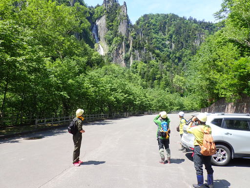 駐車場に車を停めて準備しいよいよ出発です。みんなが見上げているのは銀河の滝。