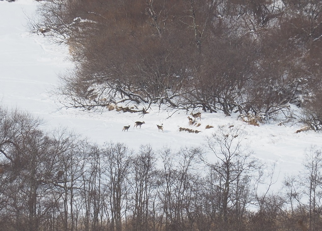 湿原に残っている個体は、結氷した川の上に出て樹木の冬芽を食べる個体が目立ちました。
