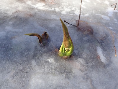 [ 氷の中で春を待つミズバショウ ]