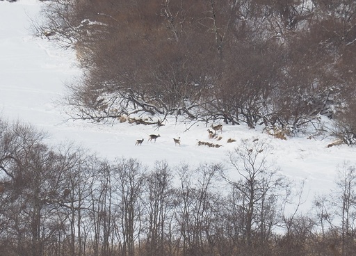 釧路湿原国立公園パークボランティアさん協力のもと行っている、冬のエゾシカのカウント調査では、1月初旬の大雪を境に、湿原部のカウント数が極端に少なくなりました。食べている植物が雪の下に埋もれてしまったことも要因ですが、やはりエゾシカ達も、寒さを逃れて風の遮られる丘陵地に入るのでしょうね。
