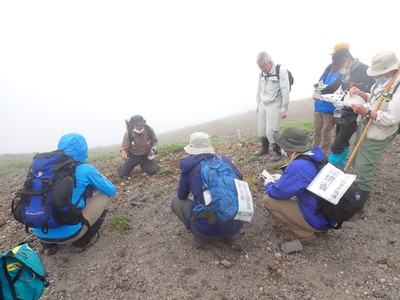 除去地点に到着後、長年除去作業に携わって下さっている講師の方からコマクサの生態や特徴について解説いただき、作業開始!