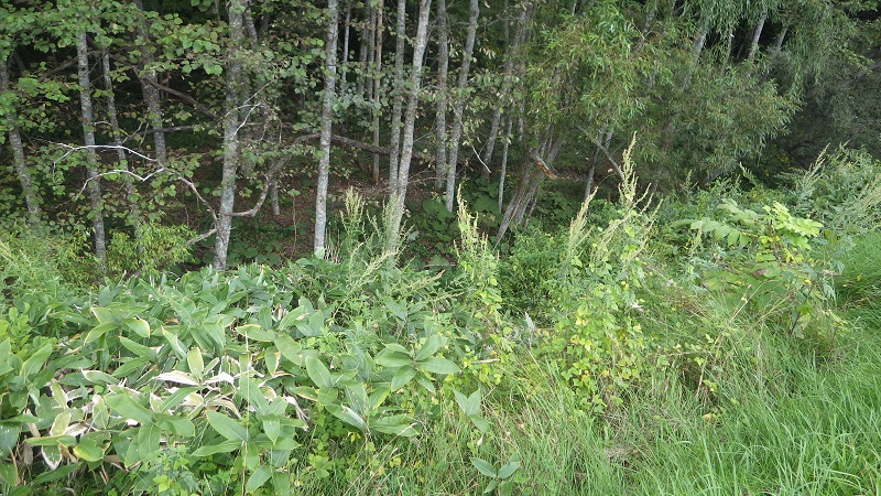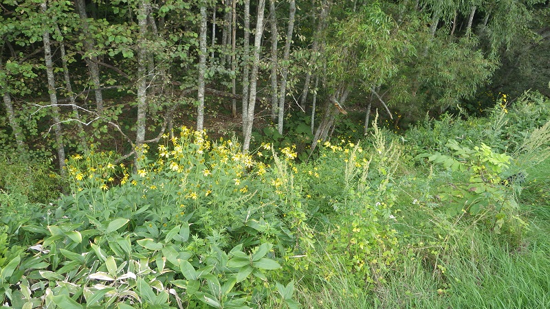フキやササ、イラクサの混在する茂みからオオハンゴンソウを根茎ごと掘り取るのは辛い作業です。次の写真は糠平国道の道路脇を見下ろした様子です。乗用車の運転席からは一部しか見えないかもしれませんが、大型バスからは黄色い花が広がる生育地全体が見えるに違いありません。写真の範囲の124本を駆除するのに1時間以上かかりました。土壌に石が混じっていたり、フキの根に癒着していたり、ササの根と絡み合ったりしているととても厄介です。
