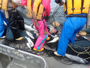 このような状況で、上記写真のように毎日ゼニガタアザラシが被害をもたらしているとなれば漁師の気持ちも昂りません。