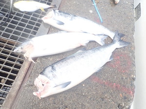 始まったばかりの水揚げ内容は、サケよりもブリが上回っていましたが、漁が始まり約1ヵ月。日を追うごとにサケが増えてきました。これは喜ばしいことですが、サケと同時に増えてくるのが「トッカリ喰い」。