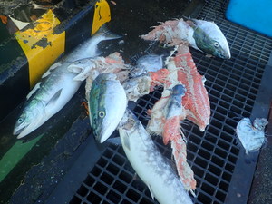 ▼近年のトッカリ喰い(胴部分が喰われボロボロ...サケもブリも被害を受けています)