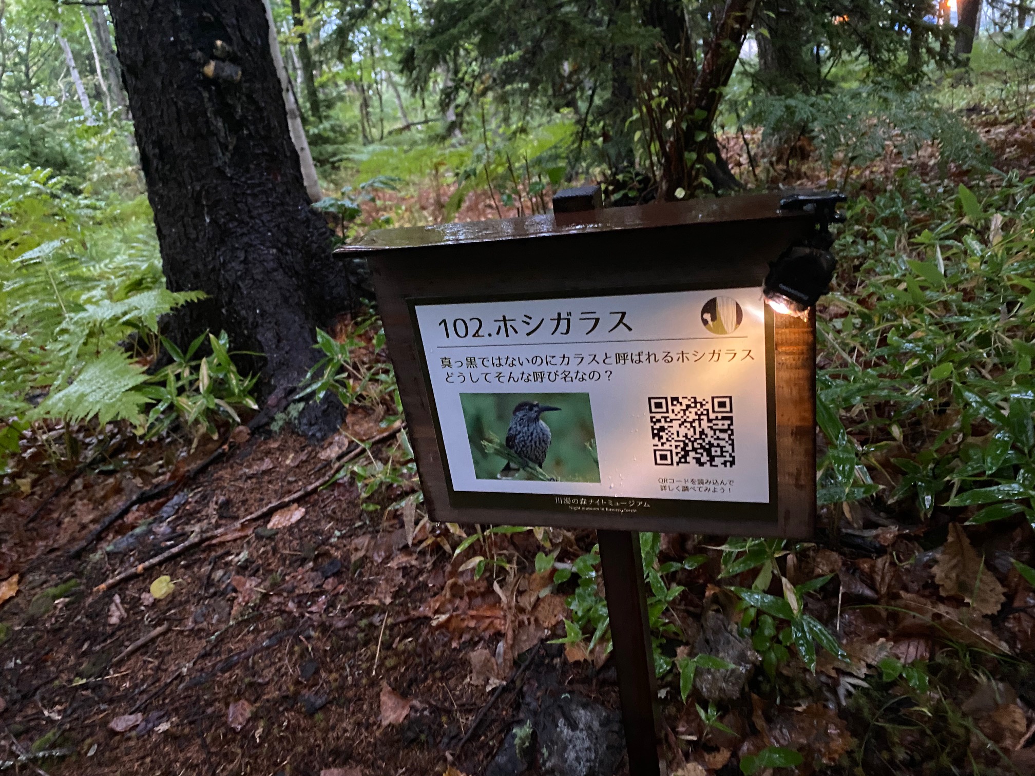川湯の森が立体図鑑に変身した「図鑑の森」は、一部の木々がライトアップされると共に、シマフクロウなどの彫刻の野鳥たちを見ることができます。道中には、スマートフォンと連動する解説板が至る所に設置してあり、川湯の森や生き物たちへの知識をさらに深めることもできます。
