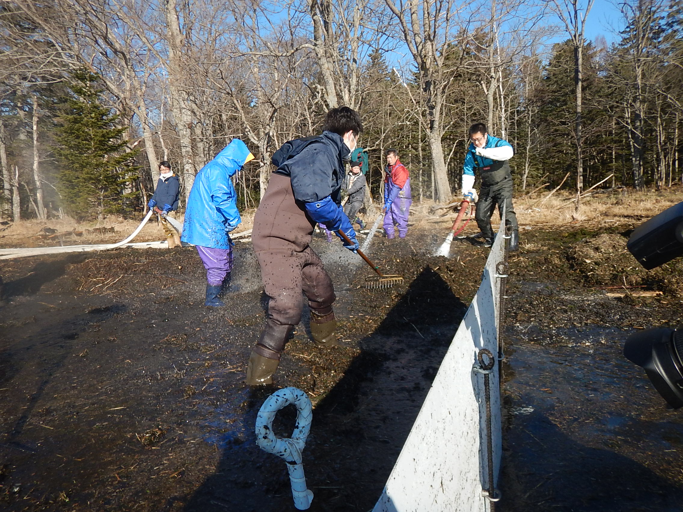 当日の最高気温は5度。吐く息も白い中、皆さま胴長を着込んで水と泥にまみれながら作業に没頭し、約6時間かけて無事作業を終えました。