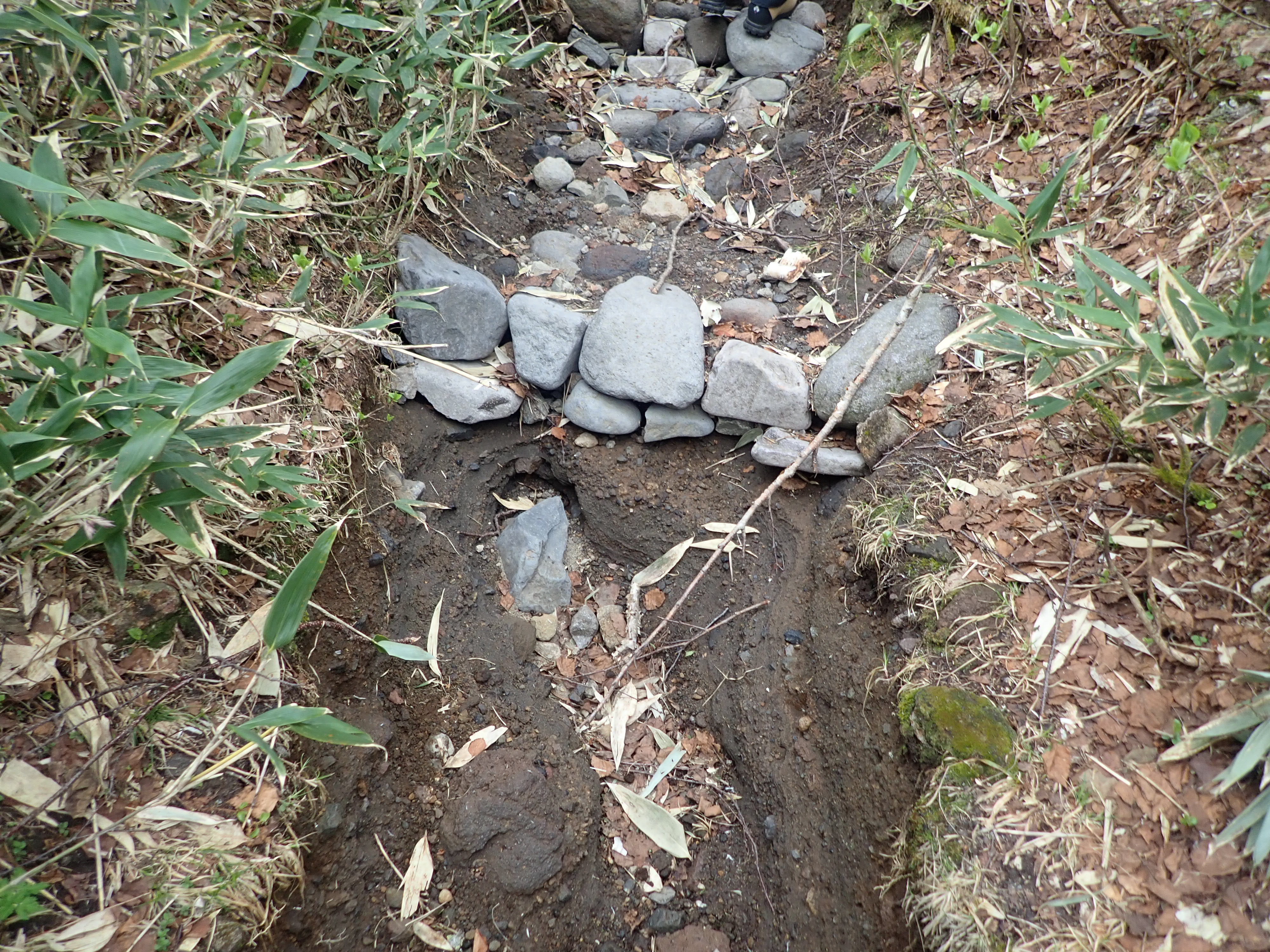 ↑石組み崩壊の様子。大雨により石が流れ、土壌が侵食されてしまっています。