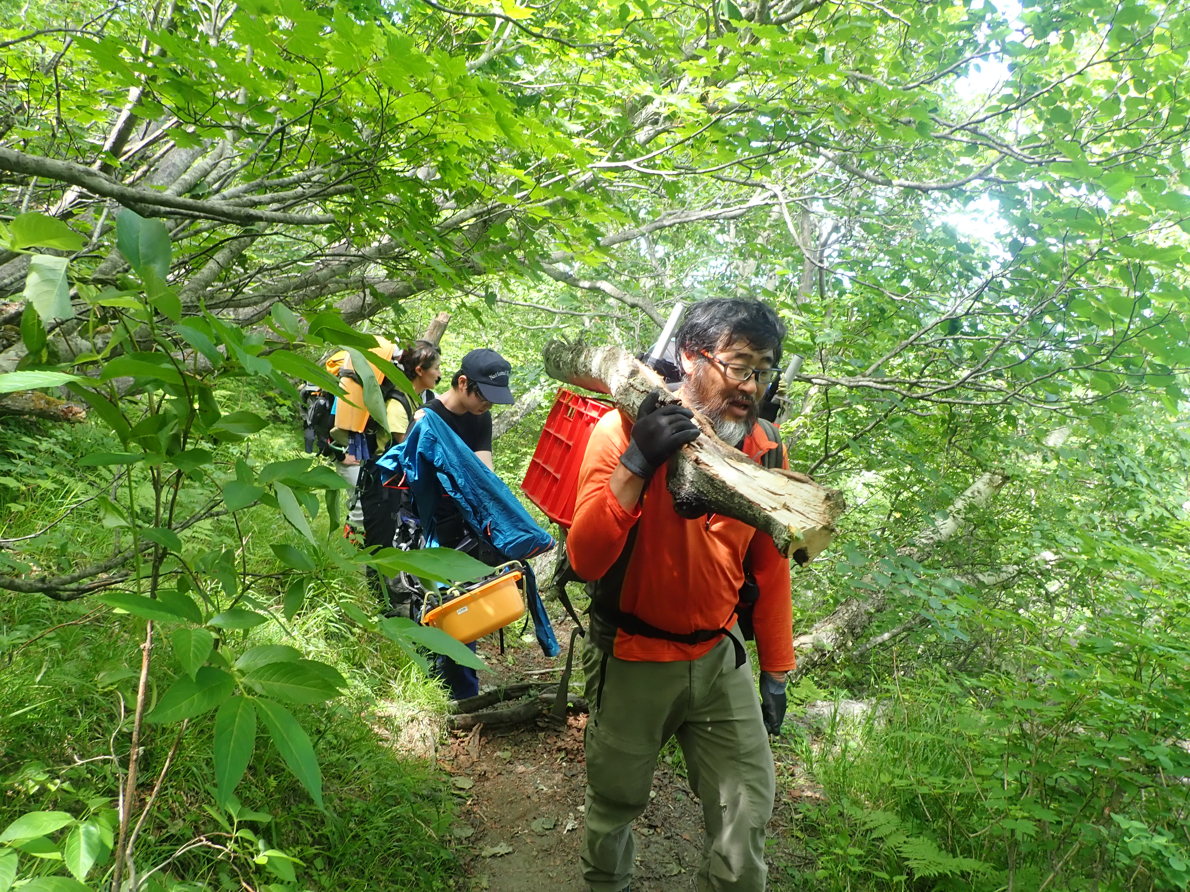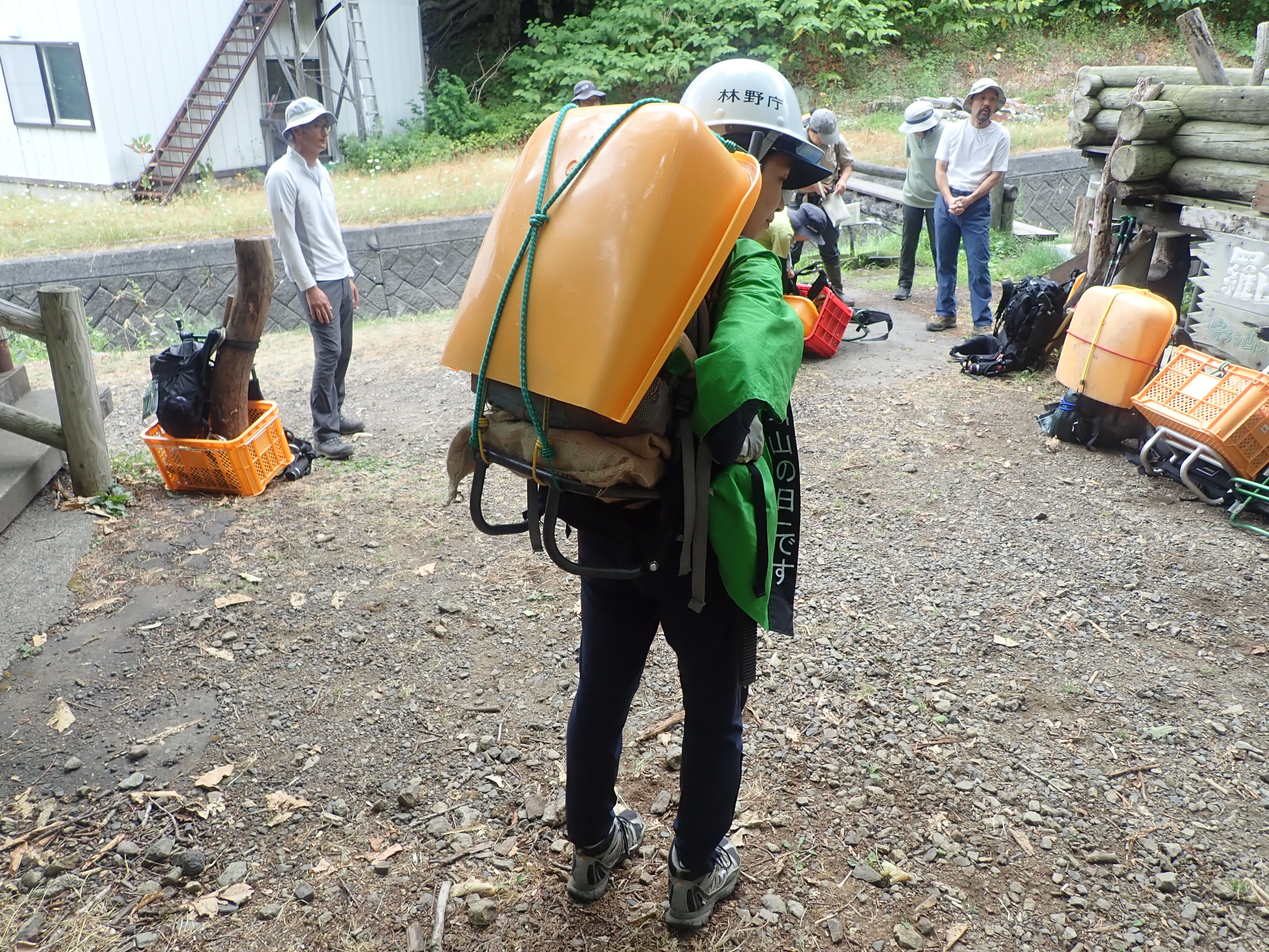登山道の整備を行うためには、まず、作業に使う資材や工具を目的の場所まで荷上げする必要があります。土のう袋で岩を運ぶ人、木材を担ぐ人、整備道具を持つ人、個人の体力を踏まえながら役割分担をします。