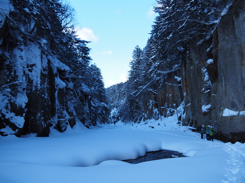 層雲峡は溶結凝灰岩の柱状節理が有名ですが、大函では両岸に柱状節理があるためそれを間近で観察する事ができます。夏場は水量もありラフティングでしか立ち入る事ができないのため、ゆっくりと見られるこの観察会は冬の層雲峡のおすすめコースです。