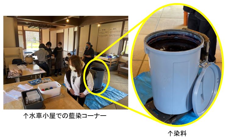 水車小屋では、藍染体験を行っていました!囲炉裏、縁側のある静かで風情ある空間で、少人数でゆっくりと藍染を堪能でき、午前・午後ともに大人気な体験となっていました♪