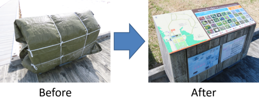 昨年の11月、冬の間に風雪で木道などの案内板が痛まないようにシートの取り付けを行っています。今回は雪が溶け春を迎えるにあたりシートの取り外しを行いました。