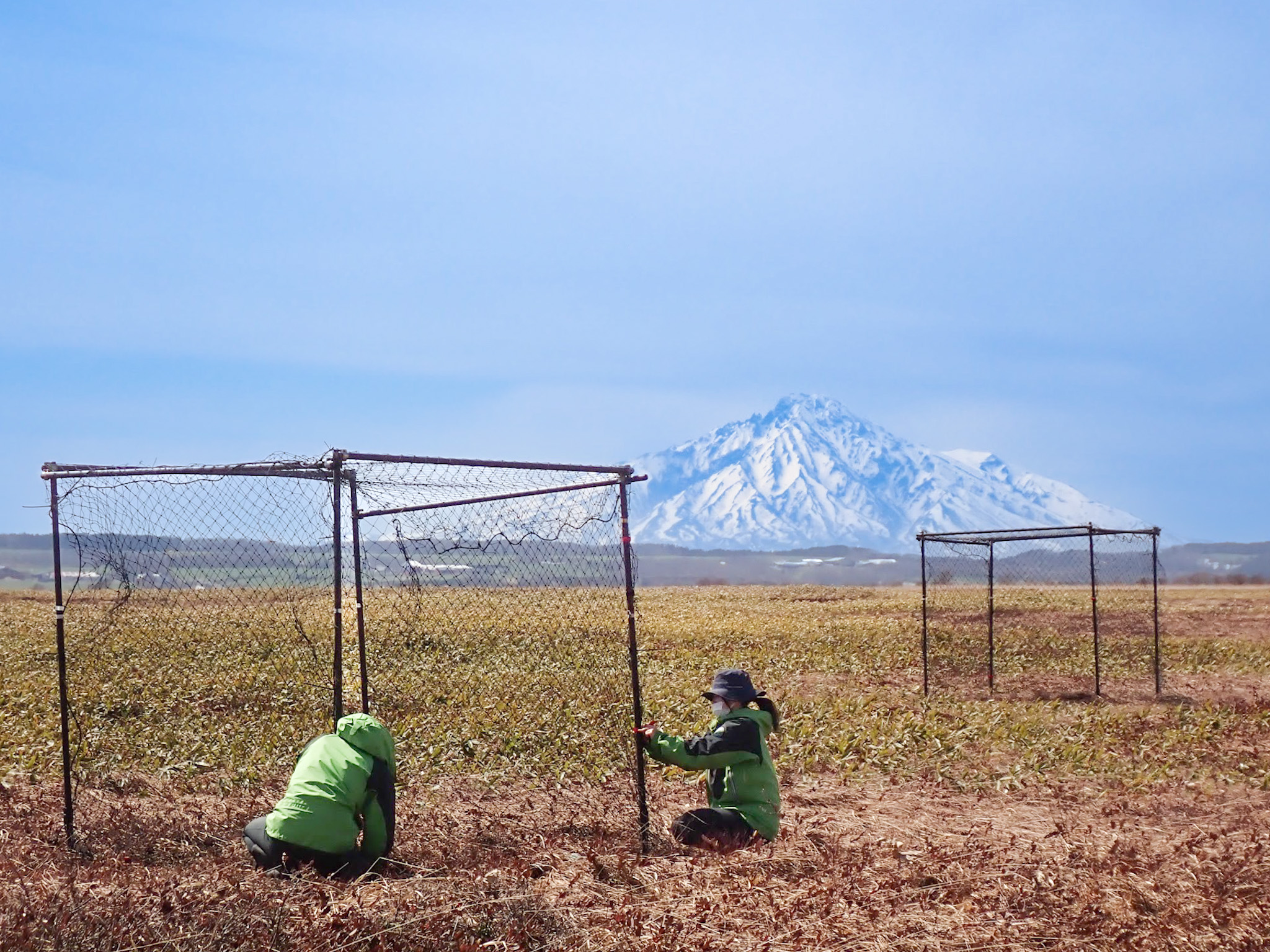現在は湿原に咲く希少な植物がエゾシカに食べられないように春先にはネットを張り、柵の中の植物を守っています。