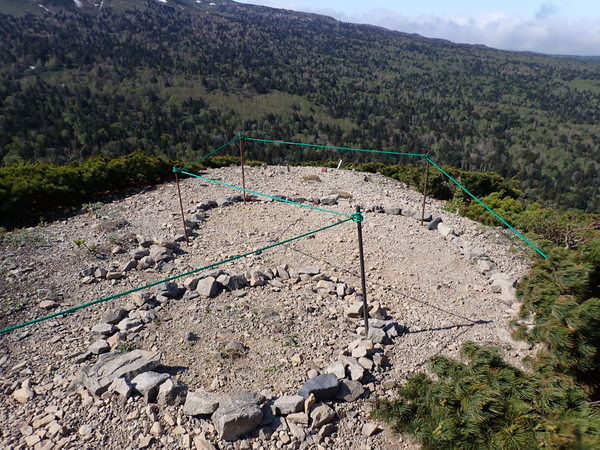 山頂は、高山植物の生育地を避けつつ、登山者の方に景色を楽しんで頂けるように、今年は特殊な形状に設置しました。