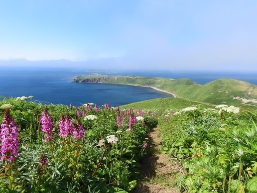 6月下旬になると、レブンシオガマ(Pedicularis chamissonis var. rebunensis)が咲き始め、歩道の両脇を彩るように咲き続いていて、海まで続いているかのように感じさせてくれます。同じ時期には、エゾカンゾウ(Hemerocallis dumortieri var. esculenta)やチシマフウロ(Geranium erianthum)も咲き始め、カラフルなお花畑が広がり、写真ではなかなか伝えきれない素晴らしい景色を体感出来ます。