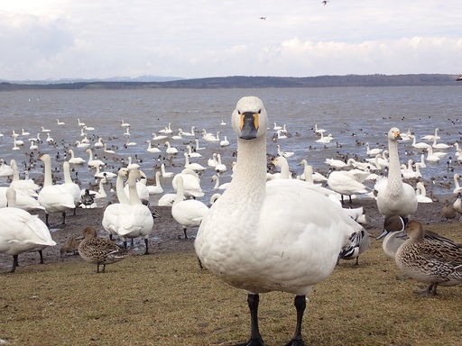 3月から4月にかけて、本州で冬を過ごしていたコハクチョウ(Cygnus columbianus)が北へ帰る途中、クッチャロ湖に集結し始めます。春のピーク時には約6000羽が集まり、湖からは合唱が響き渡ります。たくさんのコハクチョウの中の1羽が「主役は私だ!」と主張しているような瞬間に出会いました。クッチャロ湖で休息し、元気に帰っていくことを願いたいです。