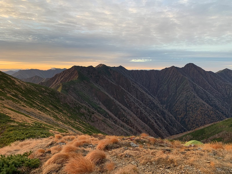 周囲の北の無名沢、南のサッシビチャリ沢はどちらも日高屈指の険谷であり、主稜線から離れた存在感のある独特な山容は遠くからでもよく目立ちます。夕暮れには初雪が舞い、早朝の霜を踏みしめて歩いた晩秋の荒涼とした山は、空気が澄み渡り、遠方の稜線まで良く見渡せました。