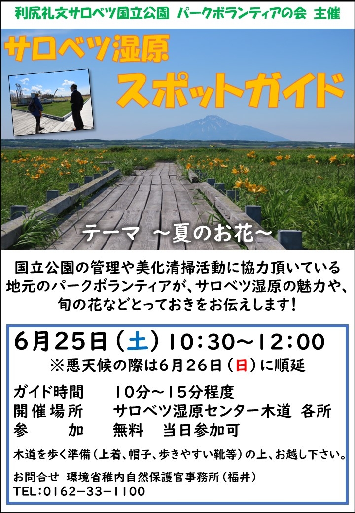 スポットガイドでは利尻礼文サロベツ国立公園の管理や美化清掃活動にご協力を頂いているパークボランティアが、サロベツ湿原の魅力や、旬の花などサロベツのとっておきをお伝えします。