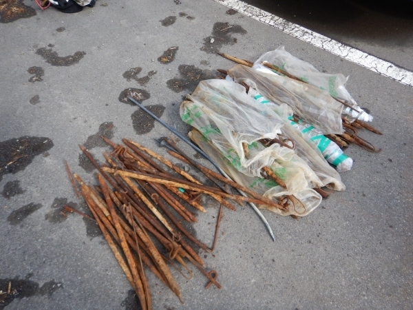 昨秋の日記でも書きましたが、古い鉄ピンは地面と固着し、ただでは抜けないので、今回は新アイテムのプライヤーやハンマー、ベテラン・ボランティアの方々はご自身が抜きやすいオリジナル・アイテム持参+涙ぐましい創意工夫のもと、この日もたくさん鉄ピンを抜くことができました!