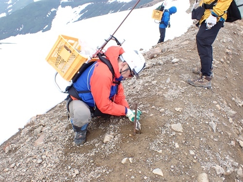 作業は入山してから4時間半後、十勝岳からはじまり、道迷い防止と植生保護のため、昨秋に下ろしたロープを上げ、古い鉄ピンは荷揚げした新品の鉄ピンと交換していきます。