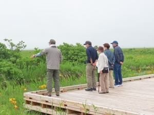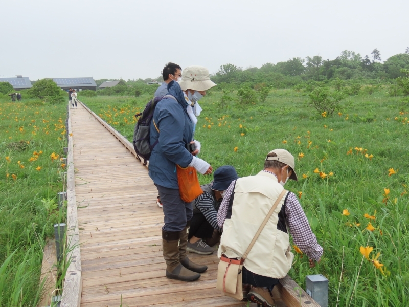 当日、木道には多くの方が訪れていました、スタッフ全員でガイドを行いながら参加者の方から話を伺うと、多くの方が満開のエゾカンゾウを目的にいらっしゃった様子でした。 実際に木道から湿原を眺めると・・・