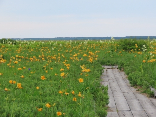 写真の通り、木道の脇から湿原の奥まで黄色い絨毯で覆われていました。 木道から見るエゾカンゾウは特に6月末から7月の初旬までが見頃です。 他にもコバイケイソウやカキツバタなどが花を咲かせていました。