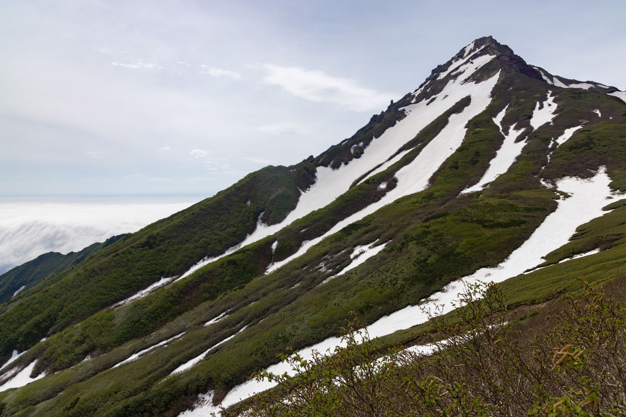 山頂から北斜面には多くの雪が残りますが、登山道上に残雪はありません。