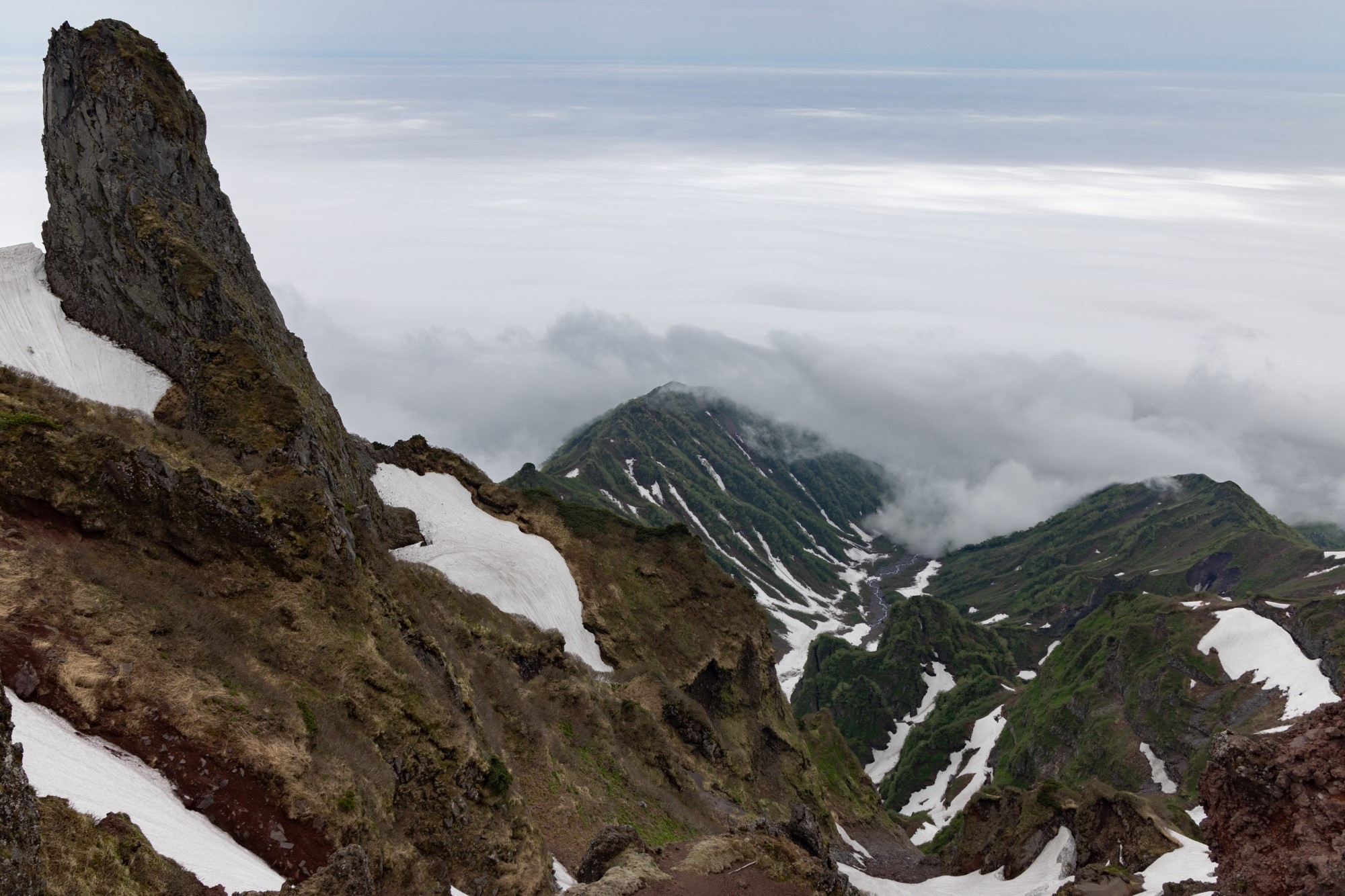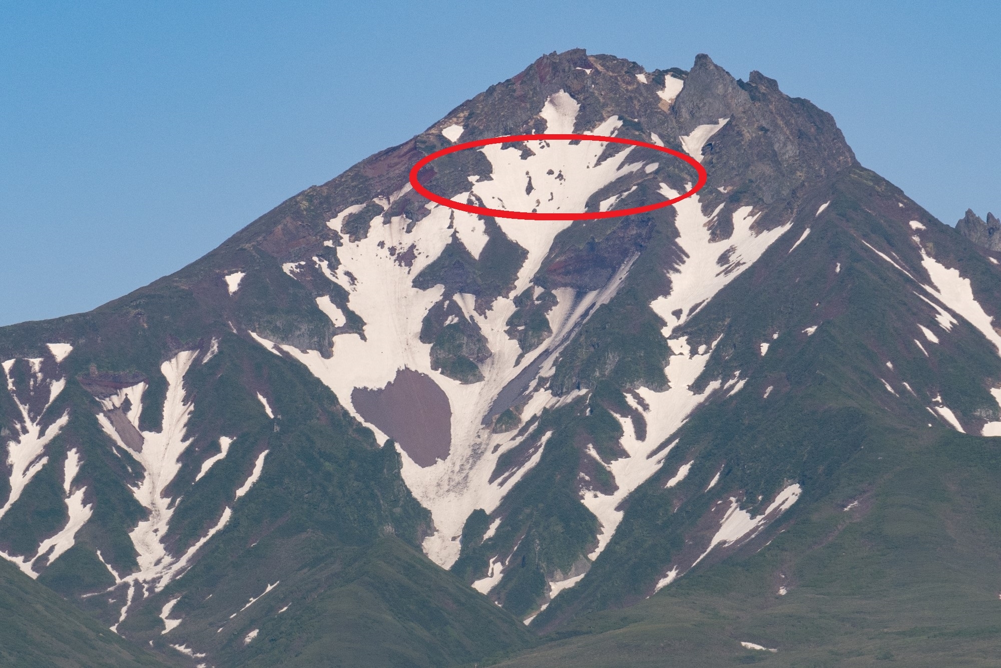 沓形コース9合目より先、親不知子不知(おやしらずこしらず)のトラバース地点はまだ多くの雪が残ります。