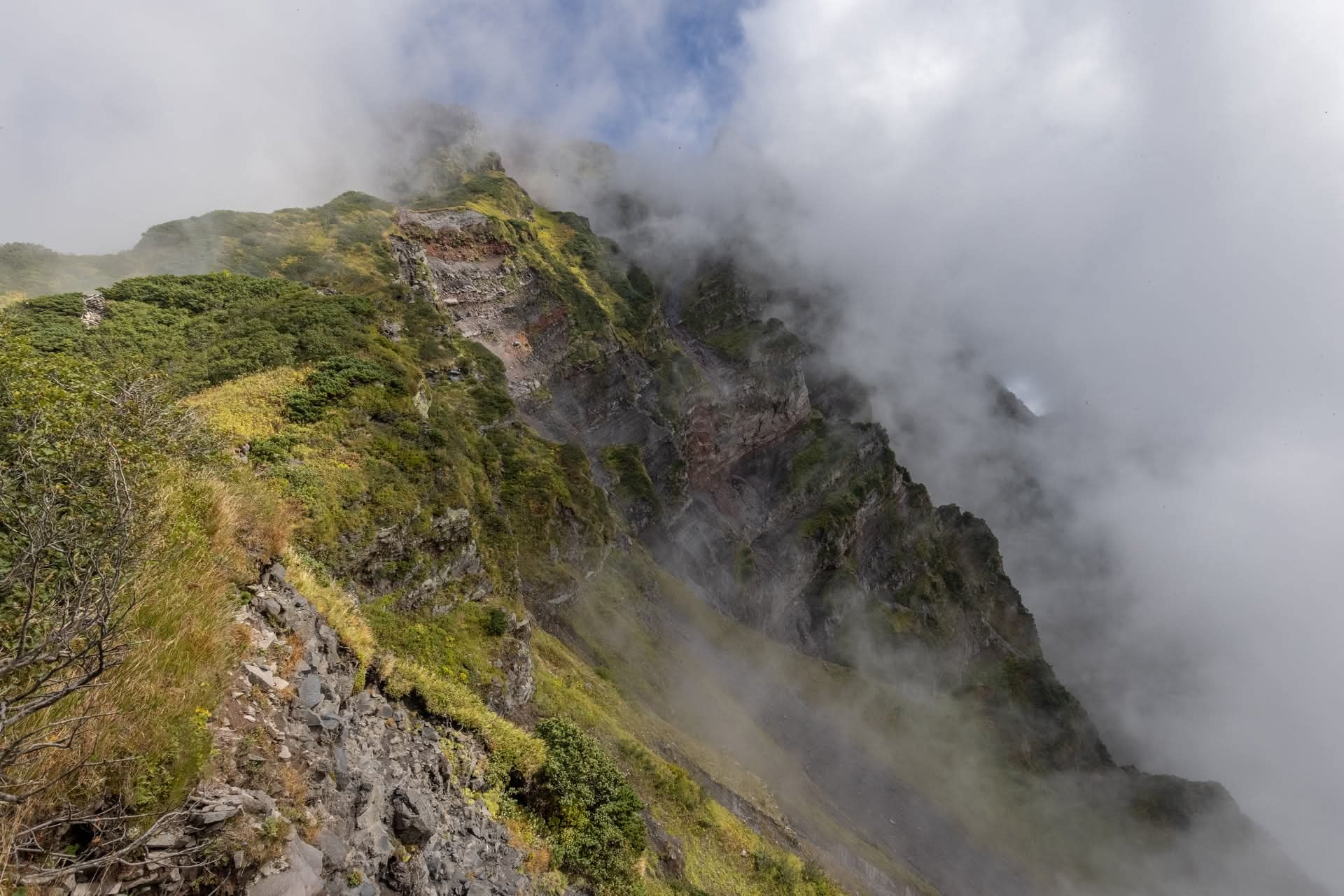 登山道崩落により、沓形コース9合目の三眺山(標高1,461m)から先の登山道が通行止めとなっています。