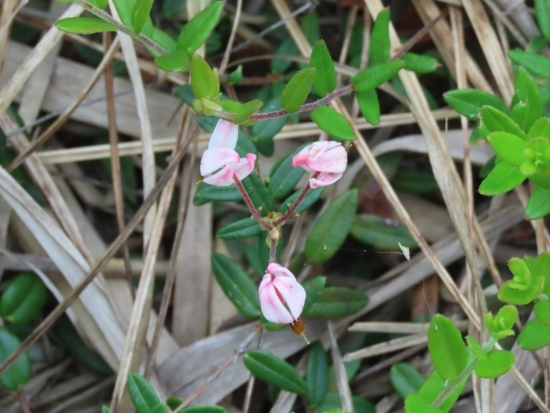 一緒にその足元を覗くと、ピンク色の小さな花がかわいらしいツルコケモモを発見しました。