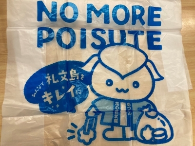このゴミ袋はバイオマス(植物由来原料)を25%配合した環境に優しい特製の袋を使用しました。また袋には礼文島のマスコットキャラクターである“あつもん”の姿が描かれています。可愛らしい袋を片手にゴミ拾いに力が注がれました。