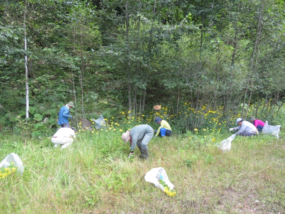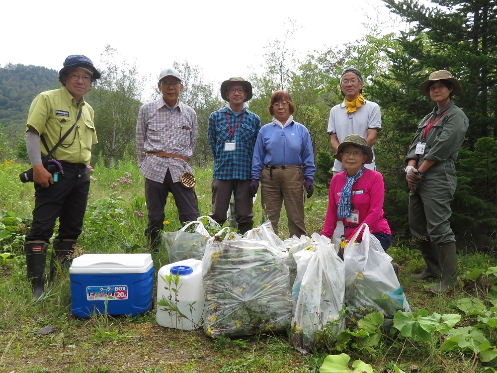 9月3日(土)、大雪山国立公園パークボランティアのみなさんと上士幌町黒石平の林道跡でオオハンゴンソウの堀取り防除を行いました。