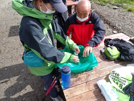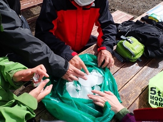 尿を固めるための凝固剤には普段触れる機会はありませんが、水をかけた凝固剤に、皆さん興味津々に実際触られ、思っていた以上にしっかりと固まっているという事に驚かれていました。実際に黒岳トイレの携帯トイレブースを利用し、配付した携帯トイレを使用していただく事もできました。