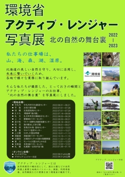 この写真展は北海道の自然保護官補佐(アクティブ・レンジャー)12名と希少種保護増殖等専門員(アクティング・レンジャー)1名が、それぞれ担当している国立公園や鳥獣保護区ついて日々の業務の紹介や、撮影した風景・動植物の写真を展示しています。