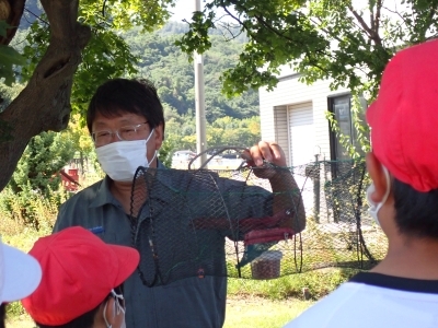 午前中に中島の散策を終え、午後からは洞爺湖温泉に戻り、UWクリーンレイク洞爺湖・室田 欣弘さまにバトンタッチし、子どもたちはウチダザリガニについて学びました。ウチダザリガニの生態や影響、捕獲方法などについて教えていただきました。