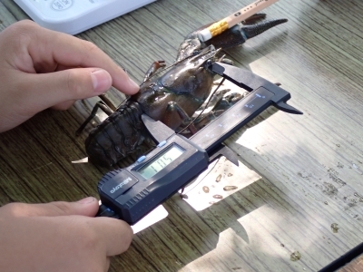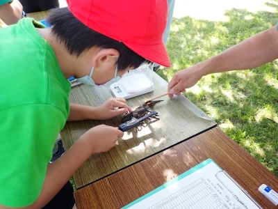 その後、ウチダザリガニの体長や重さなどを計測し、記録用紙に記録していきました。ウチダザリガニのハサミは広範囲にわたり動かすことができるため、室田さんに持ち方を教えていただきながら、子どもたちは慎重に作業に取りかかっていました。初めは怖がっていた子もいましたが、何匹か計測していく中で、恐れずにテキパキと作業をこなすことができるようになっていきました。