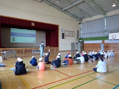 続いて、環境省・小松ARより、環境教育授業を実施しました。昨年同様、1.国立公園/2.外来生物/3.エゾシカ/4.ゴミ問題/5.野生動物との関わり方 をテーマにお話しました。