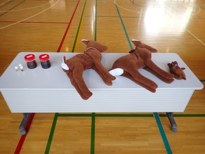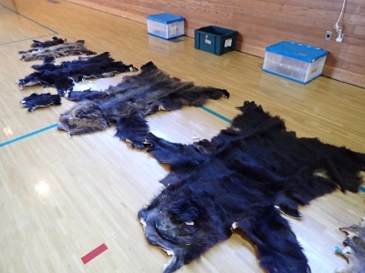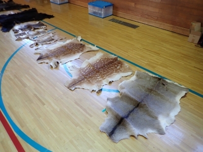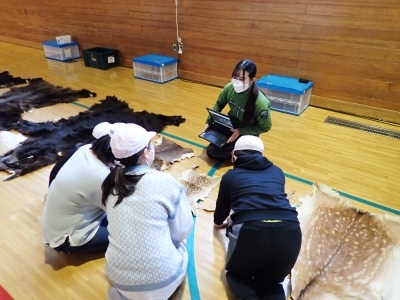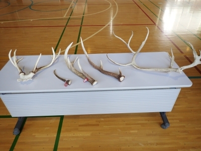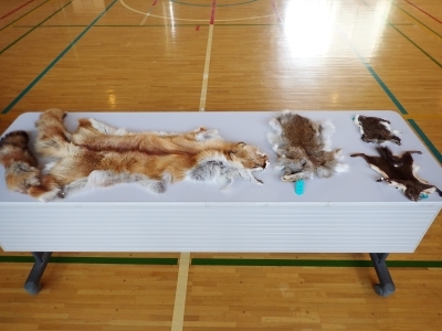 「エゾシカ」に関する授業では実際にたくさんの種類の動物の毛皮・エゾシカの角・エゾシカの胃内容物・新生児体重標本(ぬいぐるみ)などを“見て”、“触って”学んでもらいました。エゾシカの夏毛と冬毛では毛量や皮膚の厚みが違うことや、エゾシカとヒグマの新生児の体重等を体感として覚えることができたかと思います。
