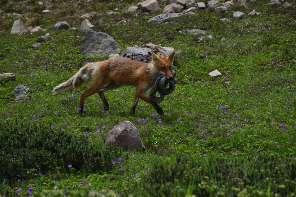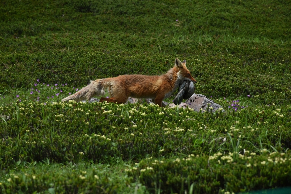 調査をしながら緑岳の第二花畑の登山道を歩いていたら、そこから5mくらいの距離をヘビをくわえ