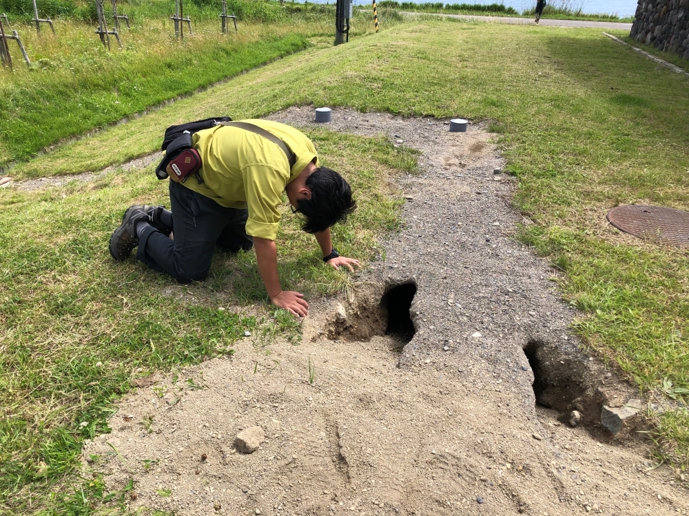 【キツネに掘られた穴を見て呆然とする塚本自然保護官】