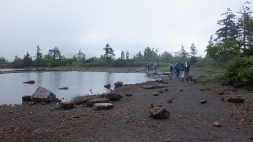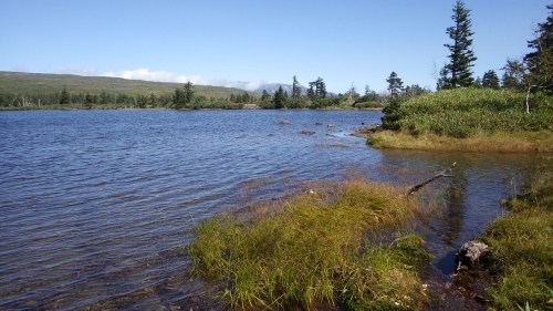 9月、ヒサゴ沼周辺の現地調査のため通りかかったところ、沼ノ原大沼は満々と水を湛え野営指定地は利用できそうにない状況でした。夏山シーズンの初め、雪解けの水が引くまで大沼に水が満ちているのは毎年のことですが、大雨により水没することも珍しいことではないようです。