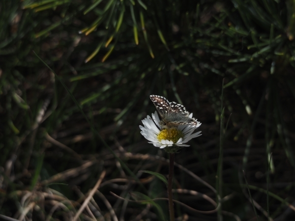 ヒメチャマダラセセリは、焦げ茶に白いまだら模様がある3センチほどの蝶です。幼虫の食草であるバラ科のキンロバイに卵を産み、日本では、アポイ岳周辺に限って生息しています。