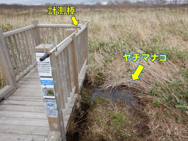 3m60cmほどの計測棒も設置しておりヤチマナコの深さを体験することができます。