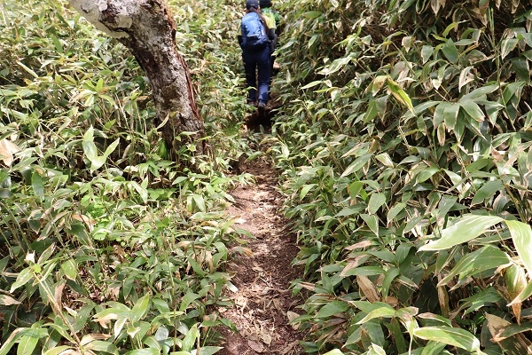 作業前の登山道は歩くと両腕にササがぶつかってしまうような状態でした。