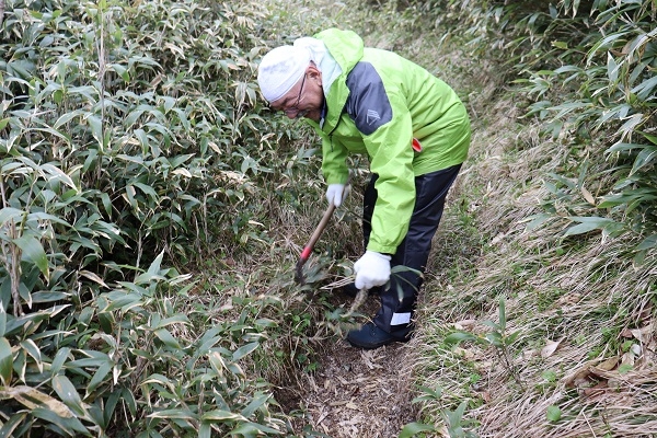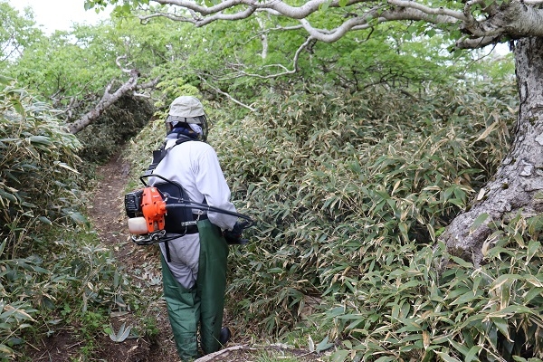 今回の活動では、登山者にぶつかってしまうササを刈り取り、快適に登山ができるよう、登山道を整備しました。