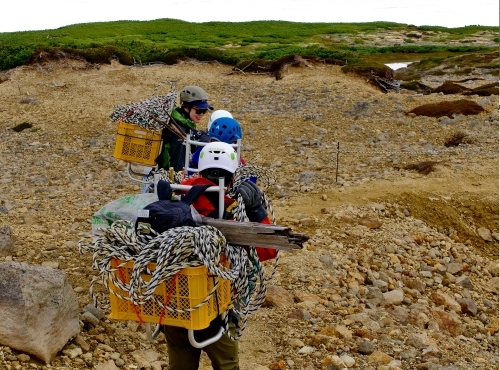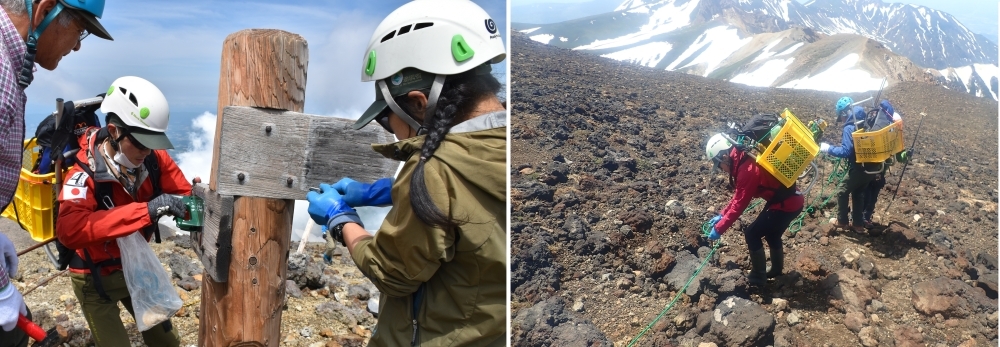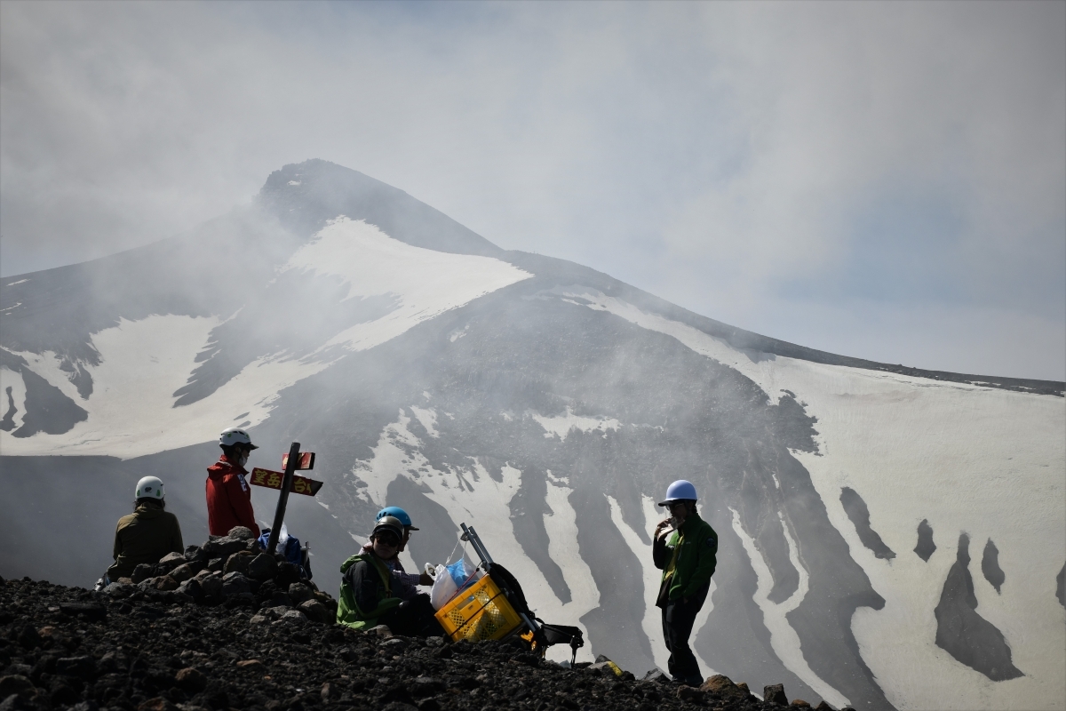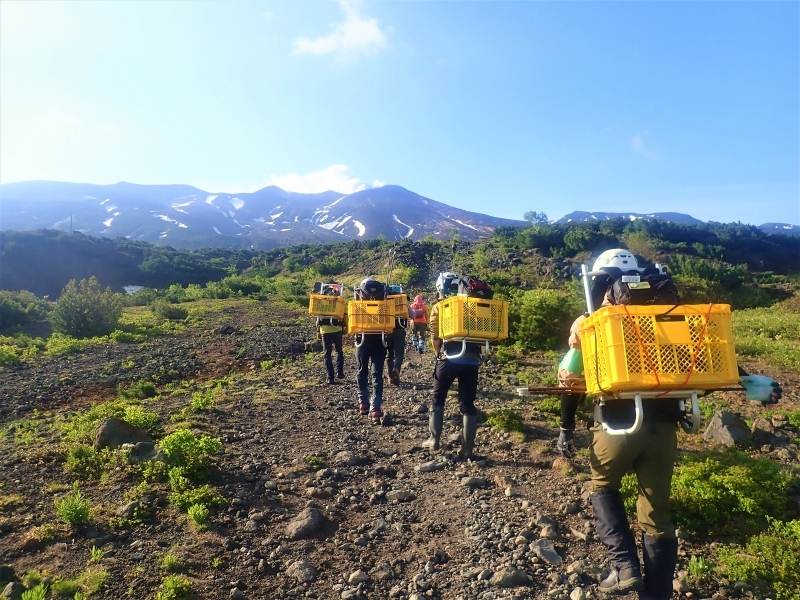 作業は歩き始めて4時間後、十勝岳のピークからはじまります。ただ登るだけでなく、荷揚げをして、更にそこから作業スタートなので、パークボランティアの中でも精鋭部隊が活躍します。