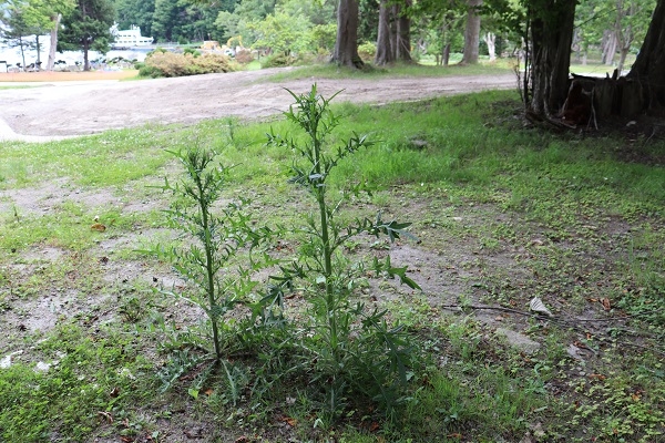 輸入された穀物や牧草の中に紛れ込んでいたアメリカオニアザミが、湖を超えて中島に生育しているのは、何かのきっかけで持ち込まれてしまったからに他なりません。